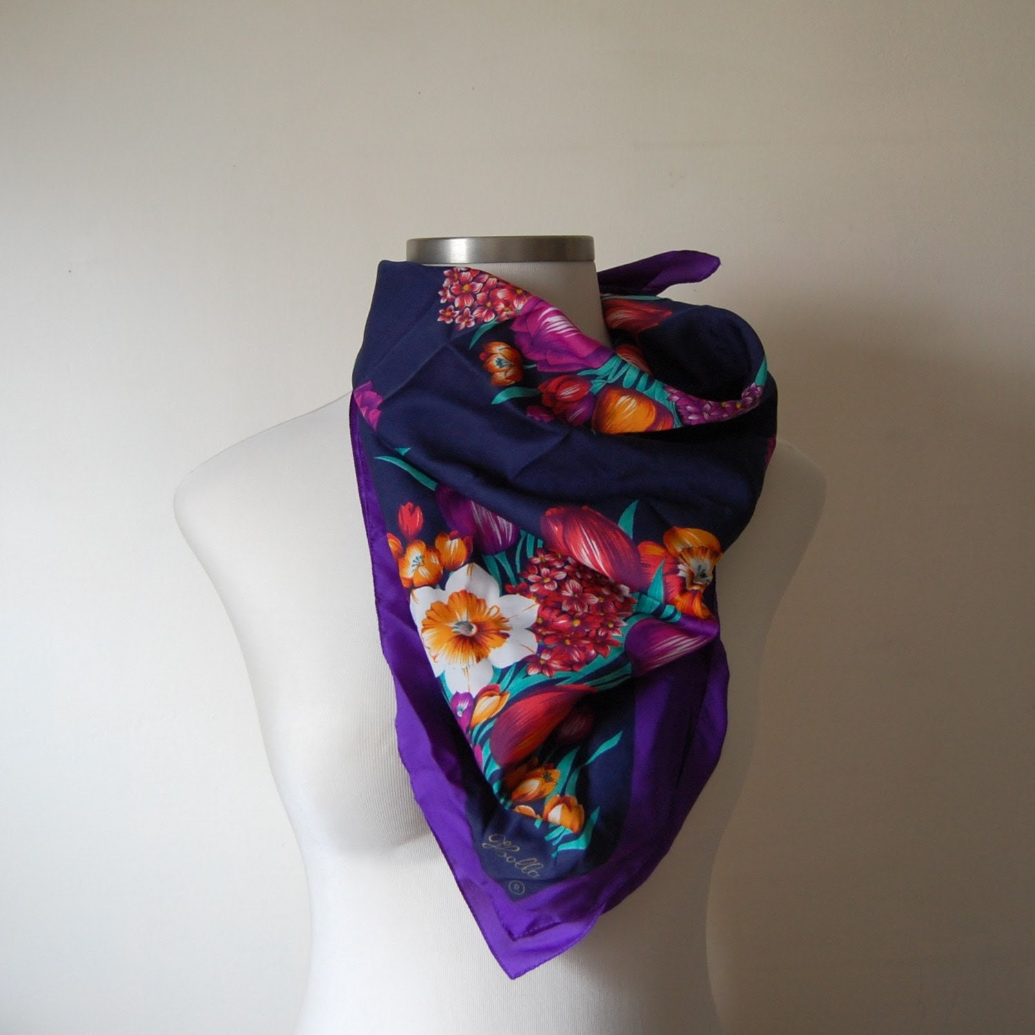 Vintage FIORI TROPICALI Large Multi-color Square Floral Pattern Scarf in Purple, Yellow, Red, Green, White and Blue from awildtonic